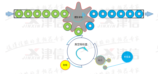 如圖中所示;設備采用了真空旋轉(zhuǎn)式標盤,具有吸標、傳輸、貼標等多方面功能,同時涂膠輥與切刀輥負責標簽的切斷與涂膠,并設有‘無瓶不出標’和‘無標不涂膠’功能,提高了貼標效率與工作的可靠性。