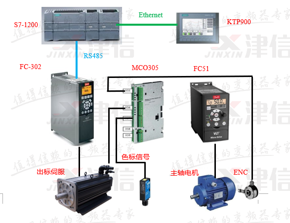 PLC與觸摸屏之間進行Ethernet通訊,PLC與丹佛斯FC302變頻器之間進行RS485通信,通過觸摸屏可以設置標長、對標位置、出標起始位置等工藝參數(shù);FC302變頻器控制出標伺服電機,以保證出標精度及響應精度。