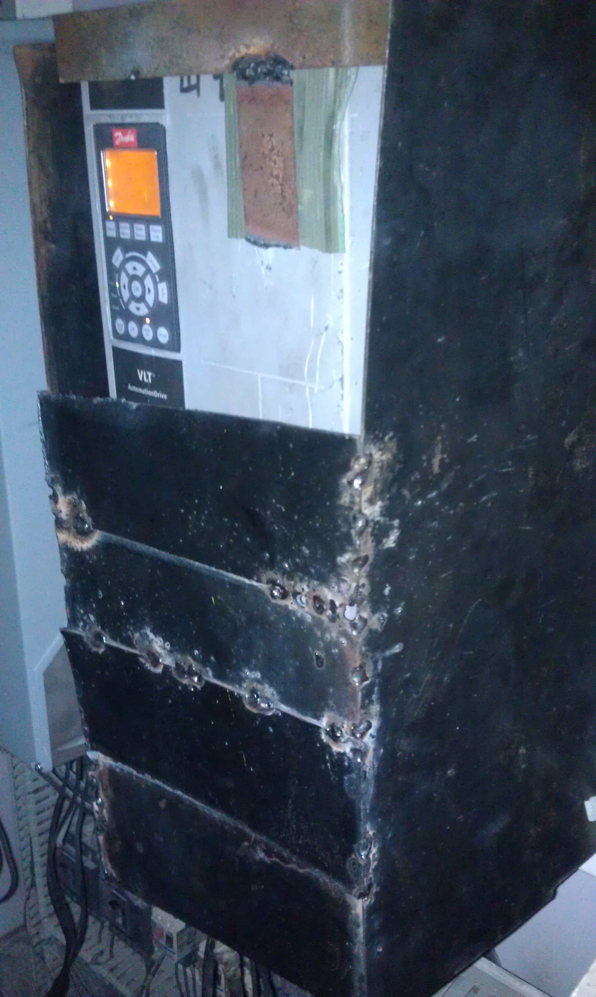 最后通過以上分析,現(xiàn)場服務(wù)工程師決定對新變頻器做一個磁場屏蔽的實(shí)驗(yàn),做一個鐵的環(huán)形屏蔽,如圖所示,設(shè)備重啟后馬上就運(yùn)行正常了,并且連續(xù)運(yùn)行了16個小時,期間無任何故障報警,一切運(yùn)轉(zhuǎn)正常。